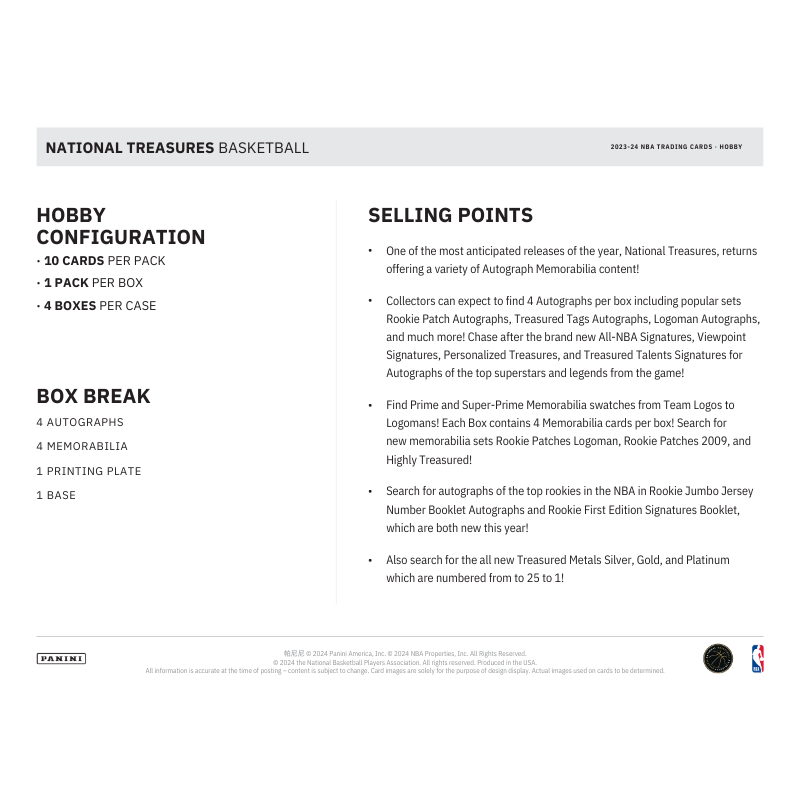 - Collectors can expect to find 4 Autographs per box including popular sets Rookie Patch Autographs, Treasured Tags Autographs, Logoman Autographs, and much more! Chase after the brand new All-NBA Signatures, Viewpoint Signatures, Personalized Treasures, and Treasured Talents Signatures for Autographs of the top superstars and legends from the game!