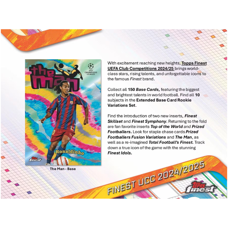 Collect the brand-new inserts Finest Skillset, highlighting the top young talents, and Finest Symphony, featuring a lineup of silky stars. Look for Top of the World and Prized Footballers, as well as key chase cards Prized Footballers Fusion Variations and The Man. Bring your hits to the digital world with Total Football's Finest, and keep your eyes peeled for Finest Idols.