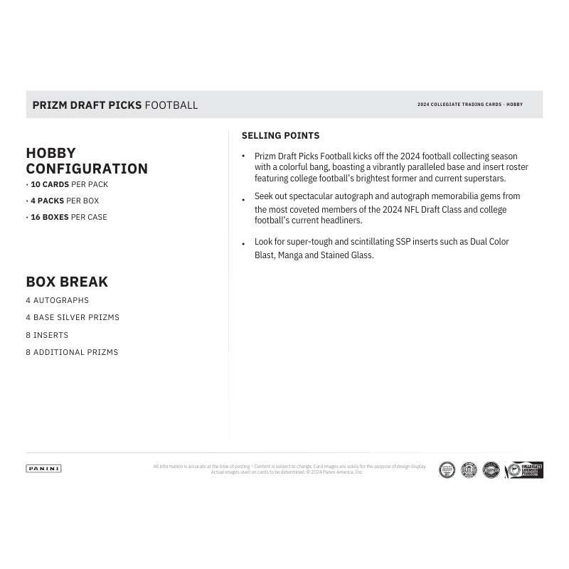 - Prizm Draft Picks Football kicks off the 2024 football collecting season with a colorful bang, boasting a vibrantly paralleled base and insert roster featuring college football’s brightest former and current superstars.